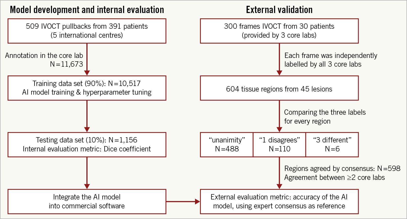 The development of the AI model was focused on clinical applications. In this regard it is important to highlight that the model was trained and validated with a large volume of IVOCT images, encompassing a range of image quality, plaque composition and lesion complexity in a representative population with ischaemic heart disease. This characteristic of the training data set is crucial to guarantee the generalisability of the CNN model. Furthermore, the external validity of the study was retested against a high-quality reference standard, the consensus of three leading international core labs, with excellent diagnostic concordance achieved for most plaque types. Although the data set for external validation was modest in size, it was of different complexity and sufficient to assess the external validity of our findings.