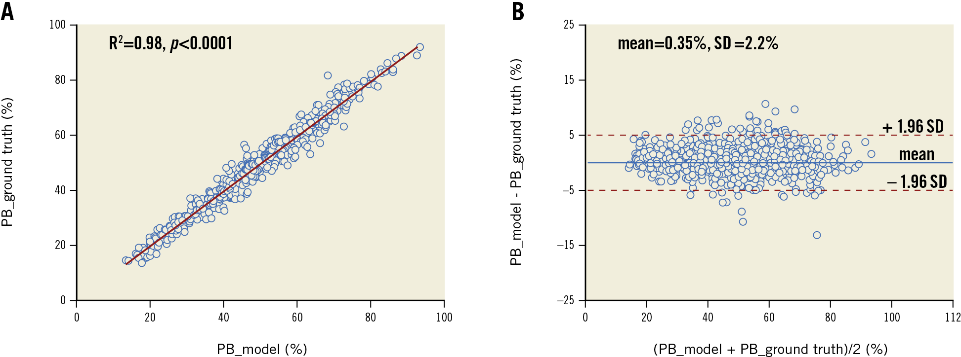 Plaque burden (PB) was calculated as the area between the estimated internal elastic lamina (IEL) contour and lumen contour, divided by IEL area and multiplied by 100%11. The accuracy in segmentation of the IEL was appraised as the agreement in PB between the model prediction and the ground truth.
