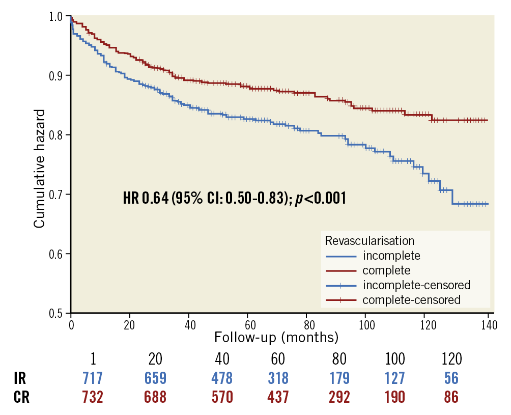 Prior studies have shown conflicting results when evaluating long-term outcomes following complete and incomplete revascularisation in multivessel CAD. Although the majority of data10,11,12,13,14,15,16,17,18,19,20,21 favours CR, there are a few studies which showed that CR alone may not improve long-term clinical outcomes in patients with MVD3,4,22. In a single-centre propensity-matched cohort, Chang et al4 compared outcomes in those with CR versus IR and found that there was no significant difference in the primary outcome of all-cause mortality (8.6% vs 9.0%; HR 1.03, 95% CI: 0.80-1.32, p=0.83), as well as in the secondary outcomes of stroke and repeat revascularisation. Kim et al3 showed that CR alone did not improve long-term outcomes in patients with MVD and hypothesised the need for ischaemia-guided revascularisation.