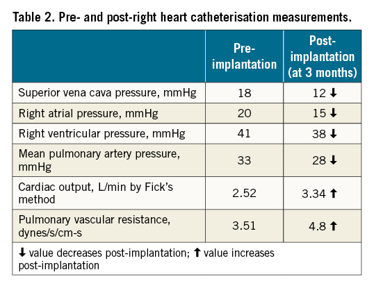 The patient was discharged on the fifth day after the procedure. The patient did not experience any adverse reaction to the procedure. She was followed up at 1 and 3 months. Clinically, she gradually improved (NYHA Functional Class I to II). Her NT-proBNP levels markedly declined to 3,963 pg/ml (at 1 month) and subsequently to 2,072 pg/ml (at 3 months). Her 6MWT also improved to 420 meters. Echocardiographic parameters also improved (Table 1) except for the left ventricular systolic function which remained the same. Invasive haemodynamic monitoring is shown in Table 2. Most parameters did improve except for the RA volume and RV diameter, which increased. This represents the variability that is noticed in patients post-TricValve implantation. However, as the patient is improving clinically, a longer time is likely required for favourable cardiac remodelling to take place. Anticoagulation with a vitamin K antagonist was planned for 1 year as there are still limited data on the efficacy of the use of direct oral anticoagulants (DOAC).