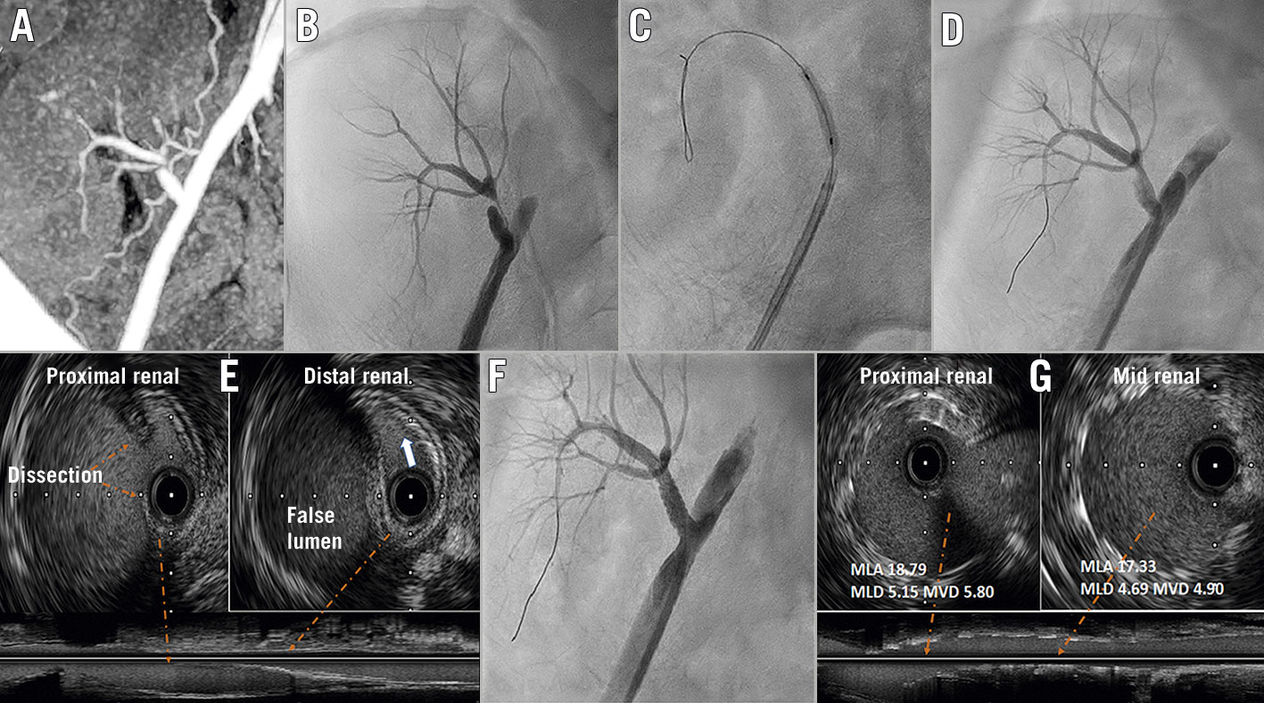 Figure 1. Percutaneous intervention of transplant renal artery stenosis. A) The tomography scan confirmed TRAS distal to the anastomotic site. B) Contrast angiography revealed narrowing of the true lumen and a diminished distal flow. C & D) The transplant renal artery was crossed with a 0.014 inch coronary guidewire and the lesion was dilated with a 2.5×15 mm balloon. E) Intravascular ultrasound (IVUS) showed dissection of the renal artery with the notably compressed true lumen. F) The stent was deployed and a good flow was achieved across the artery. G) IVUS showed a well-expanded and apposed stent. MLA: mean luminal area; MLD: mean luminal diameter; MVD: mean vessel diameter; TRAS: transplant renal artery stenosis