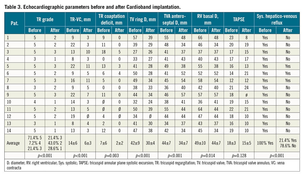 After the procedure, 11 patients no longer presented any systolic hepatic reflux, whereas systolic hepatic reflux was still observed in three patients (p<0.001). In 9 out of 14 patients, appropriate inspiratory vena cava collapse was present after Cardioband implantation (p<0.001). TAPSE declined from 18±3 mm to 15±5 mm (mean values, p=0.128).