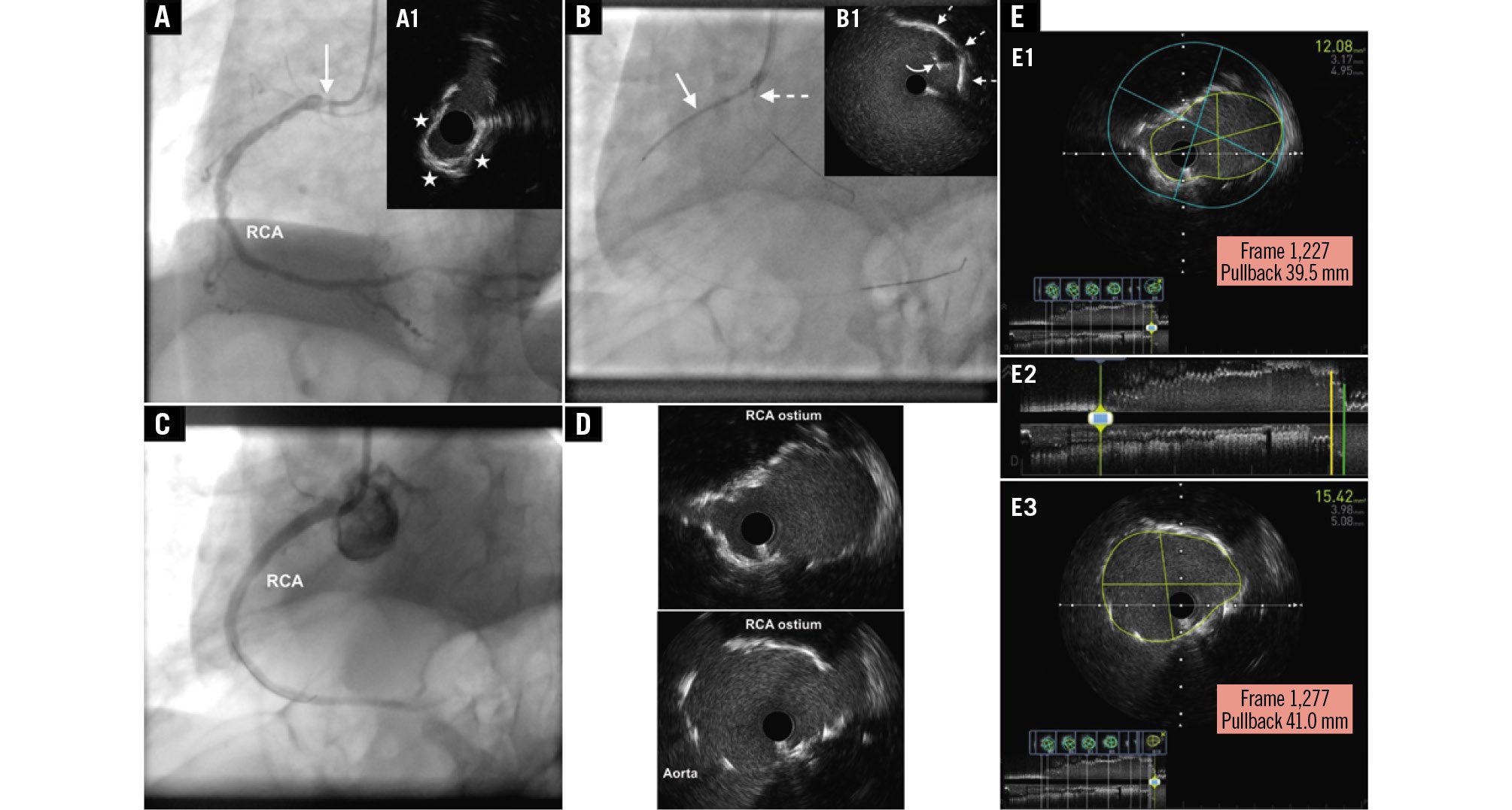 Figure 1. Conventional angiographic and IVUS images presenting the “floating” IVUS technique applied in the treatment of an aorto-ostial RCA lesion. A) Conventional angiographic image of the RCA at baseline (left anterior oblique 30° projection) depicting a high-grade ostial stenosis (arrow). Cross-sectional IVUS (60 MHz OptiCross catheter [Boston Scientific]) image (A1) depicting a severely narrowed ostium (minimal lumen area 3.5 mm2) due to a calcified lesion (calcium arc denoted by the asterisks). B) The stent is shown in position across the lesion (arrow). An IVUS catheter placed over a “floating” guidewire in the aortic root is also shown in such a position so that the transducer (dashed arrow) faces the ostium of the RCA. Cross-sectional IVUS image (B1) depicting the proximal edge of the stent (curved arrow) at the ostium of the RCA (dashed arrows), recognisable by its echogenic appearance with an acoustic shadow behind it, as opposed to a reverberation artefact, comprising arc-shaped, high-echoic lines appearing behind the proximal portion of the wrapped balloon and the balloon marker. C) Conventional angiographic image (left anterior oblique 30° projection) acquired at 30 frames per second depicting a good result after stenting the RCA lesion. D) Cross-sectional IVUS images from the RCA depicting optimal coverage of the ostium where the minimal stent area ranged between 12.0 mm2 and 15.0 mm2. E) Longitudinal view of the final IVUS recording (E2) showing complete stent coverage of the aorto-ostium (E1, corresponding to the cross-section marked with a yellow line in the longitudinal view) and a partially protruding stent (E3, corresponding to the cross-section marked with a green line in the longitudinal view) with a length of 1.5 mm (IVUS pullback speed: 1 mm/sec; frame rate: 30 frames/sec; see frame number and distance shown within the red rectangles in E1 and E3). IVUS: intravascular ultrasound; RCA: right coronary artery